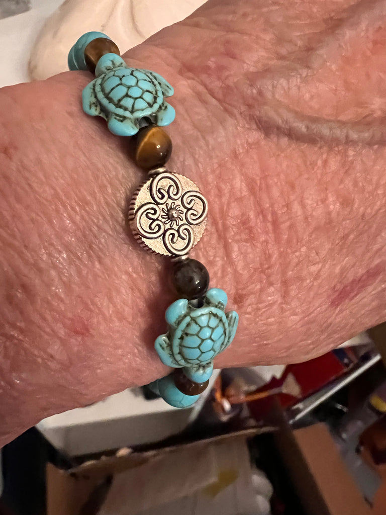 Anyone who knows me knows I love turtles especially the big sea turtles so I made these bracelets in honor of them and I donate to their care when I can. So I’m hoping I can send proceeds from each one of these sales of these bracelets to help injured sea turtles. These bracelets are made from Howlite turquoise and tigers eye , Even the turtles are Howlite turquoise. Each bracelet is 7.5 “ you can always send me an email if you need one that is a little larger and I’ll just add a couple of beads. My email is mommermaidcoaching@yahoo.com.