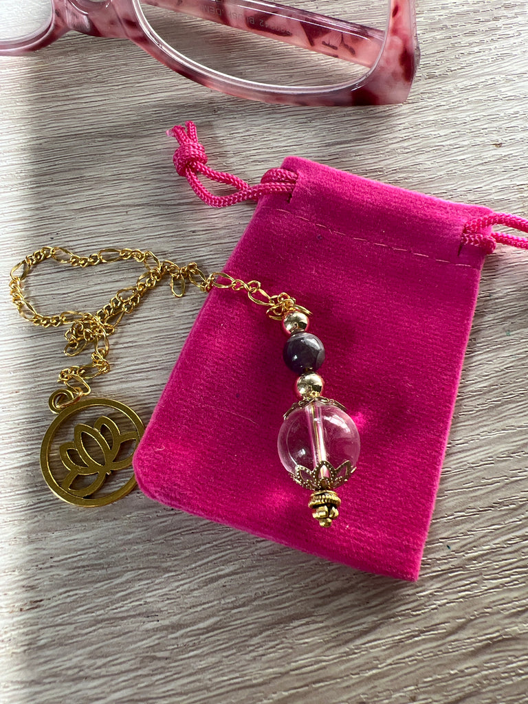 This pendulum is made with a gold chain and a large clear 12 mm clear quartz the most powerful crystal there is. It also has an 8 mm amethyst for clarity and opening up your third eye. This pendulum was divinely inspired for me to make so I did and I feel like it is very powerful and accurateand of course it’s blessed. It comes with its own pink carry case.