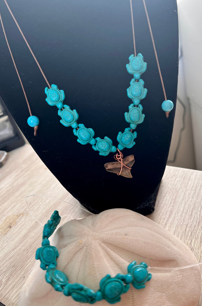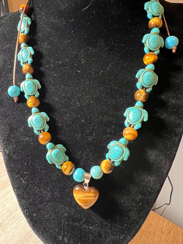 These necklaces are made with Howlite Turquoise Turtles and tigers eye. The one necklace that is the turtles and the shark‘s tooth is a one of a kind. There’s only one so once it’s gone, it’s gone. But the tigers are with the hearts I have more of those. These are beautiful necklaces, and you just slide them over your head and make them as shorter as long as you want them easy Peezy. Tigers eye is a wonderful stone it offers protection as well as drawing abundance to you tigers eye does a lot of things and the Howlite turquoise is a protection stone of course.