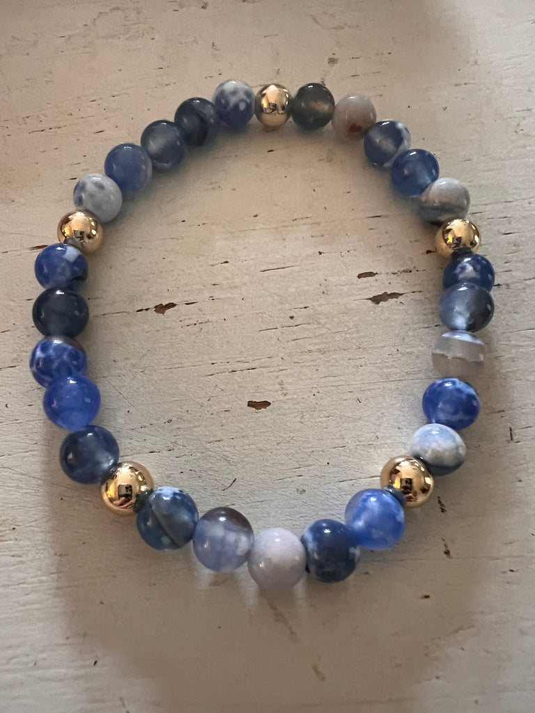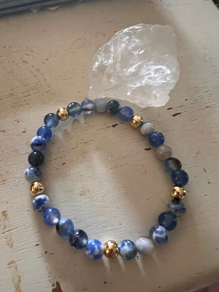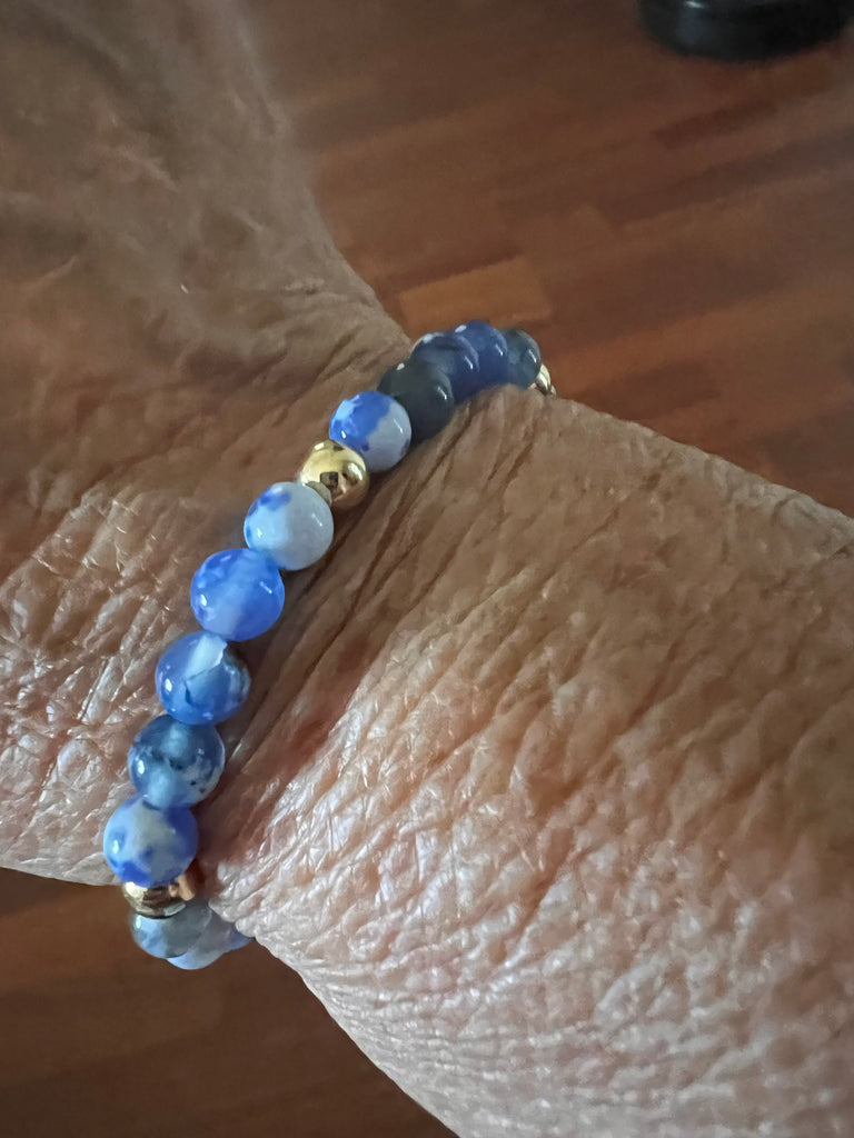 This is the original Mexican blue fire agate, which is the original return to Sender bracelet. It is very powerful and it returns to sender any negative energy that has been sent your way evil eye negative energy negative thoughts. All this will be returned to sender is made from blue fire agate 6 mm with gold accents. It’s a very beautiful little bracelet comes in 7.5 inch Size stretch bracelet. It looks very beautiful. This is one that you will want to keep for your protection